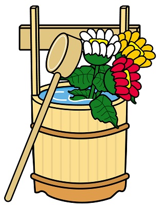 ・水(ひしゃくで水を汲み、墓石の上からかけて清めます)