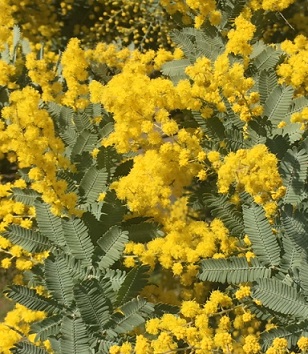 私は調布市に住んでいますが、近くのお宅の家の角に立派な銀葉アカシアがあります。3m50㎝前後の若木ですが、地上1mくらいの枝から木の頂点の枝まで花が沢山ついており、枝ぶりも豊かで、うねるように伸びた銀色の葉っぱと黄色い花のコントラストが素晴らしく豪華です。そばを通るといつも見とれてます。こんな木が家の庭にあったらいいですね。